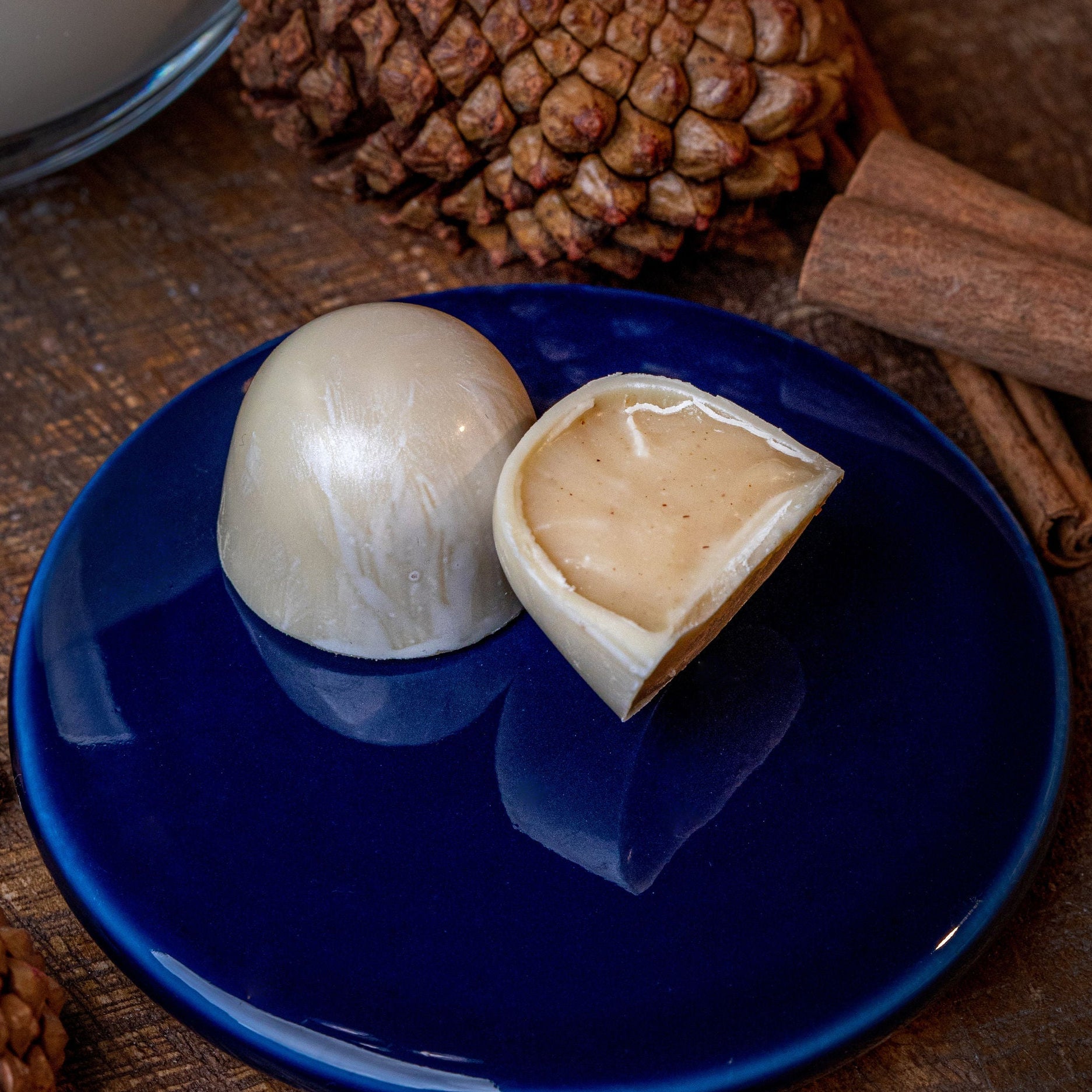 An eggnog ganache paired with a light chestnut spiced cake encased in white chocolate.